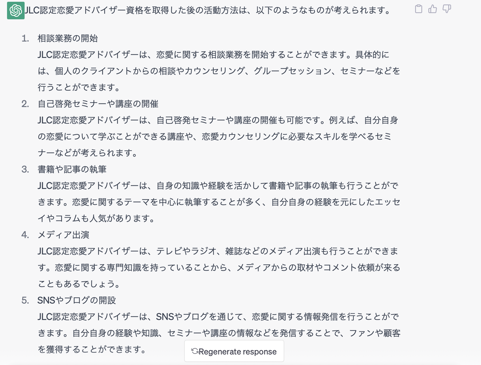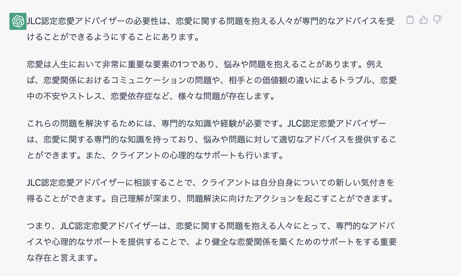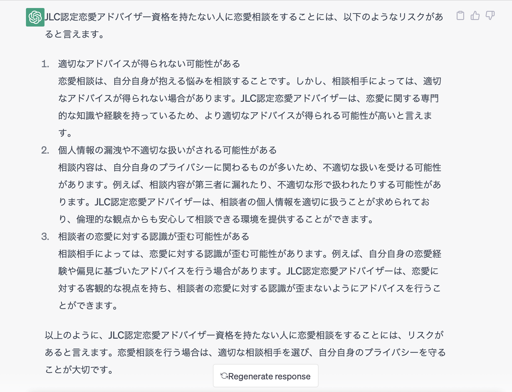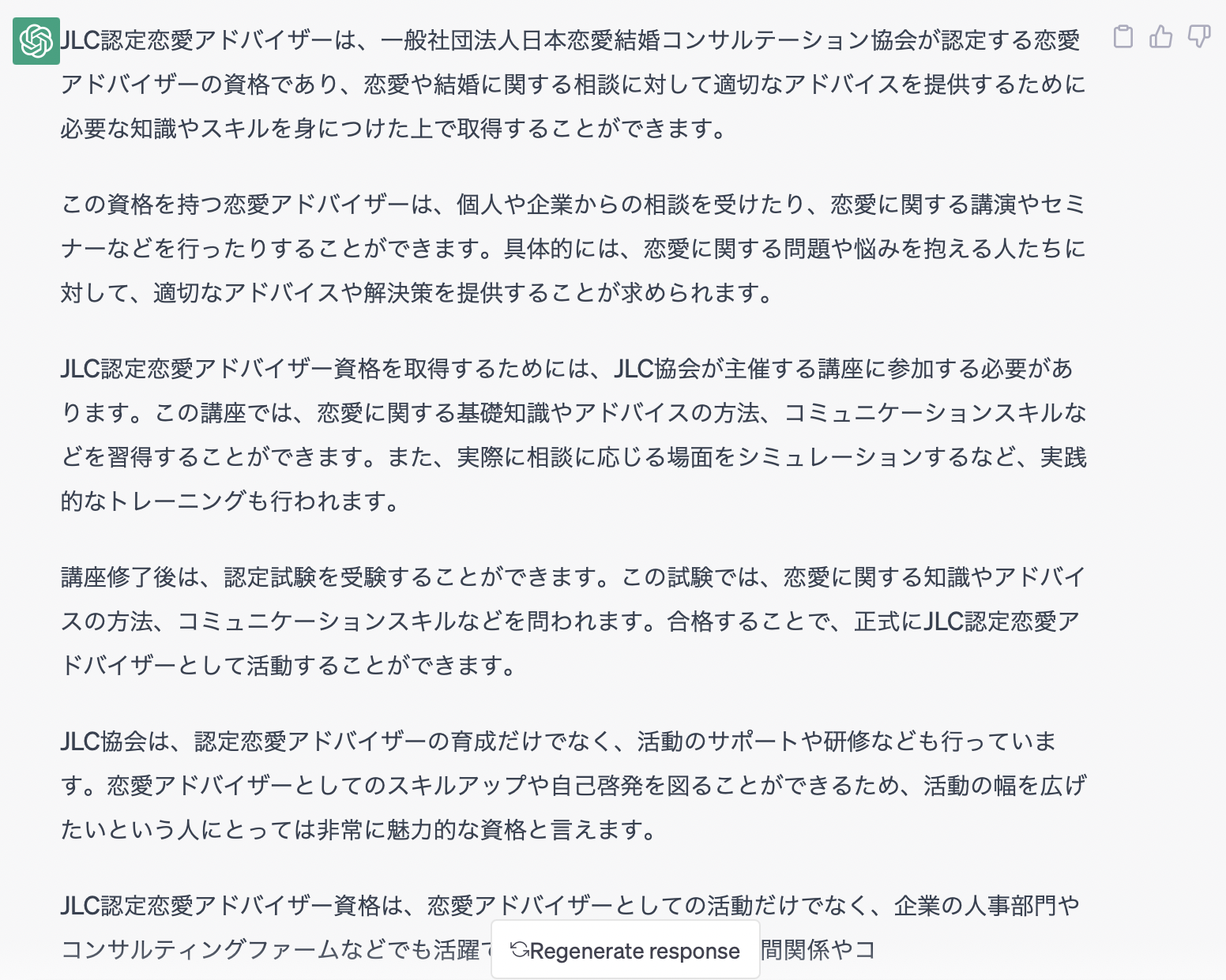 今回は、話題のChatGPTに恋愛アドバイザー資格についていくつか質問をしてみたので