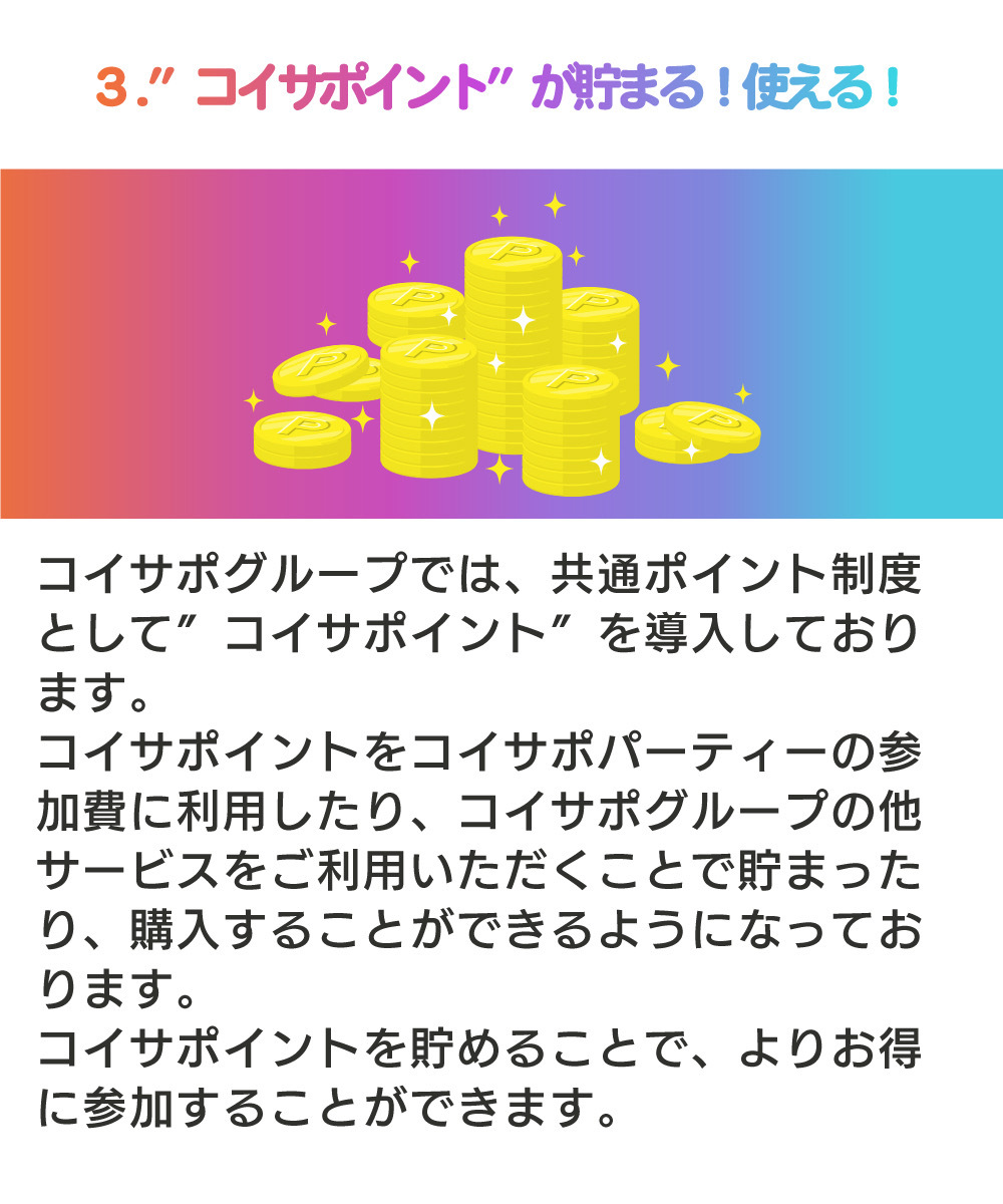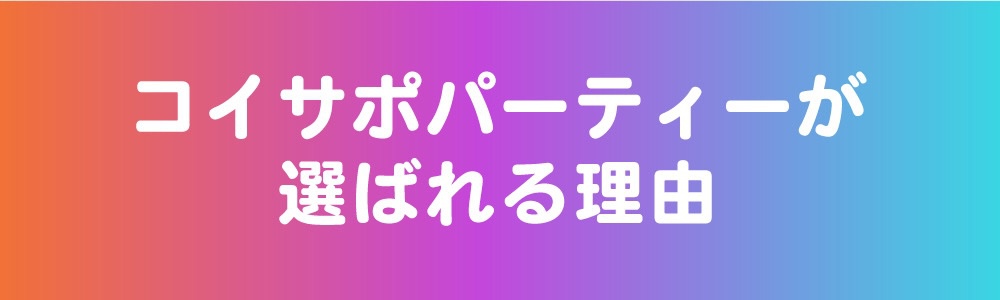 コイサポパーティは、株式会社コイサポが運営する恋活・婚活パーティ、街コンの主催をしております。素敵な出会いをお届けいたします。